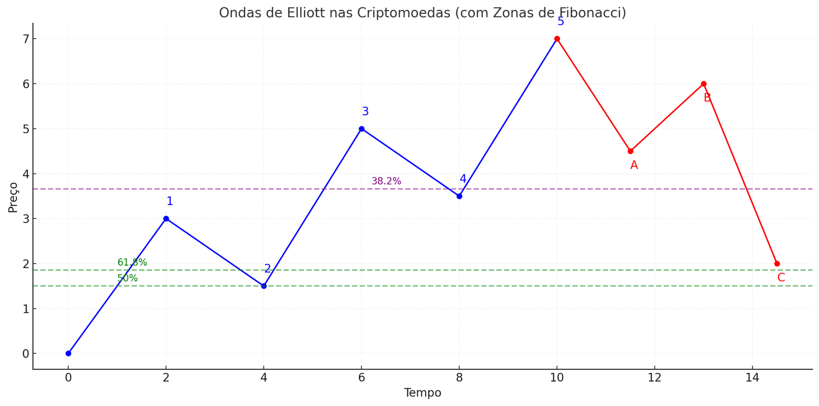 În verde și violet: zonele Fibonacci (50% și 61,8% pentru unde 2; 38,2% pentru unde 4).