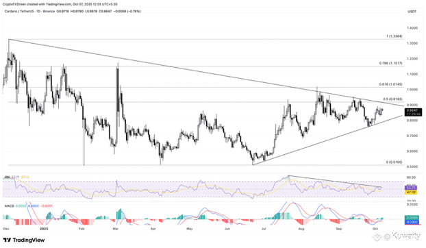 تتداول كاردانو فوق 0.8500 دولار في وقت كتابة هذا التقرير يوم الثلاثاء، موسعة الحركة الجانبية ضمن نمط مثلث متماثل تم تشكيله على الرسم البياني اليومي. تتماسك ADA بين خطي الاتجاه المتقاربين، حيث قد تزداد وتيرة الحركة ذهابًا وإيابًا داخل المثلث بالقرب من القمة.