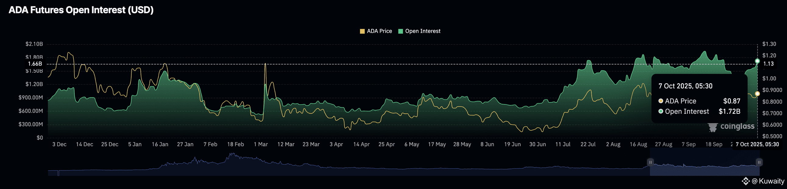 في هذه الأثناء، ينمو الطلب من التجزئة أيضًا في مشتقات $ADA ، حيث تكشف بيانات كوين غلاس أن الفائدة المفتوحة لعقود كاردانو الآجلة (OI) قد زادت بأكثر من 5% في الـ 24 ساعة الماضية، لتصل إلى 1.72 مليار. يشير الانتعاش المفاجئ في OI إلى زيادة في مراكز الشراء التي تم بناؤها حيث يتوقع المتداولون مزيدًا من المكاسب.