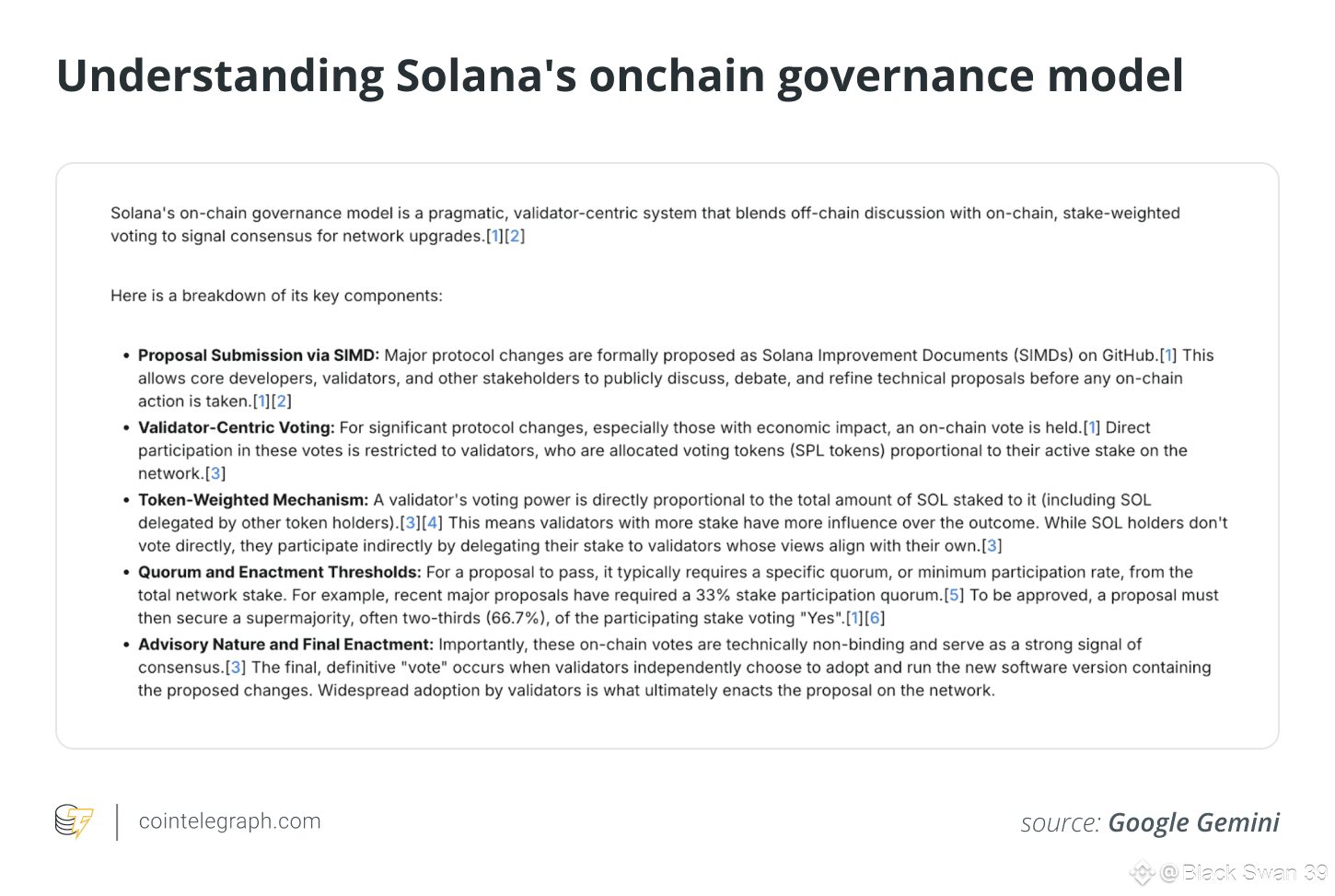 Giải thích mô hình quản trị trên chuỗi của Solana. Trình bày chi tiết quy trình nộp đề xuất, cơ chế bỏ phiếu theo trọng số token và ngưỡng đại biểu cần thiết để các đề xuất được ban hành. Hãy trình bày ngắn gọn và có cấu trúc trong tối đa 5 điểm chính.