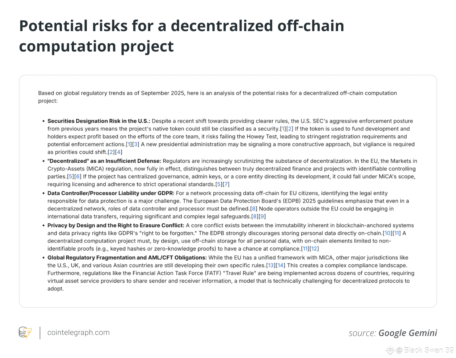 “Dựa trên xu hướng pháp lý toàn cầu tính đến tháng 9 năm 2025, hãy phân tích các rủi ro pháp lý tiềm ẩn đối với một dự án cung cấp dịch vụ điện toán phi tập trung ngoài chuỗi (tương tự Solana). Tập trung vào luật chứng khoán và các tác động đến quyền riêng tư dữ liệu tại các khu vực pháp lý lớn. Hãy tóm tắt câu trả lời trong tối đa 5 điểm chính.”