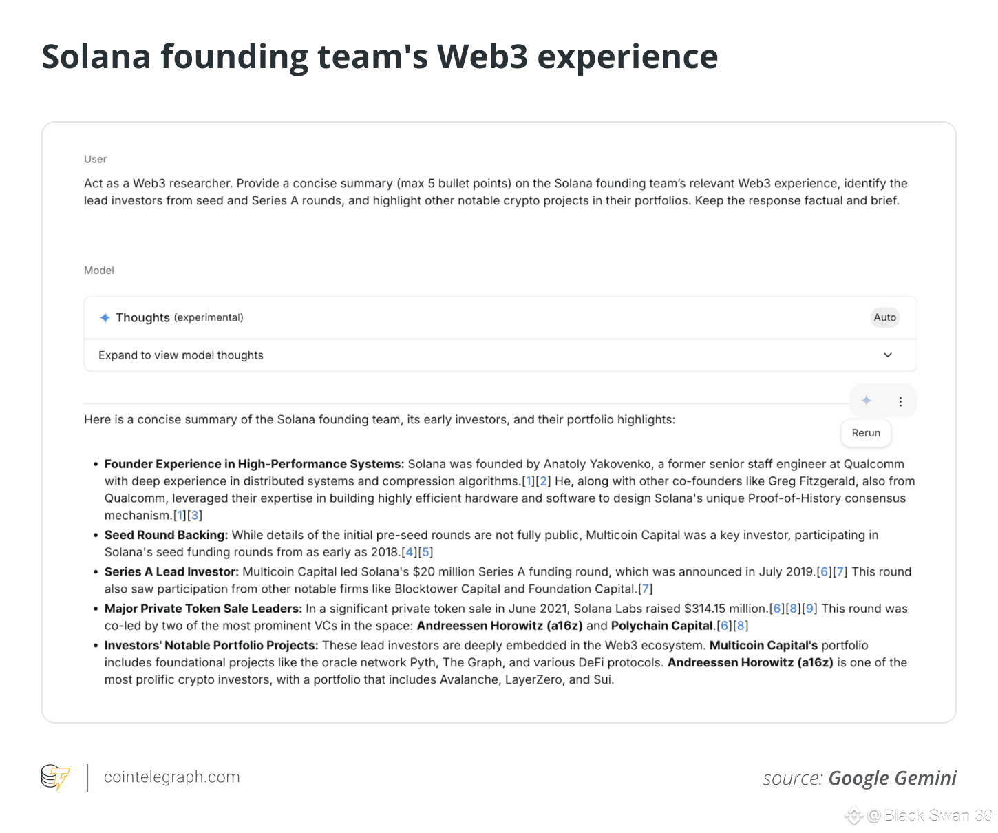 “Hãy đóng vai trò là nhà nghiên cứu Web3. Hãy tóm tắt ngắn gọn (tối đa 5 điểm chính) về kinh nghiệm Web3 liên quan của đội ngũ sáng lập Solana, xác định các nhà đầu tư dẫn đầu từ vòng hạt giống và vòng Series A, đồng thời nêu bật các dự án tiền điện tử đáng chú ý khác trong danh mục đầu tư của họ. Hãy trả lời một cách thực tế và ngắn gọn.”