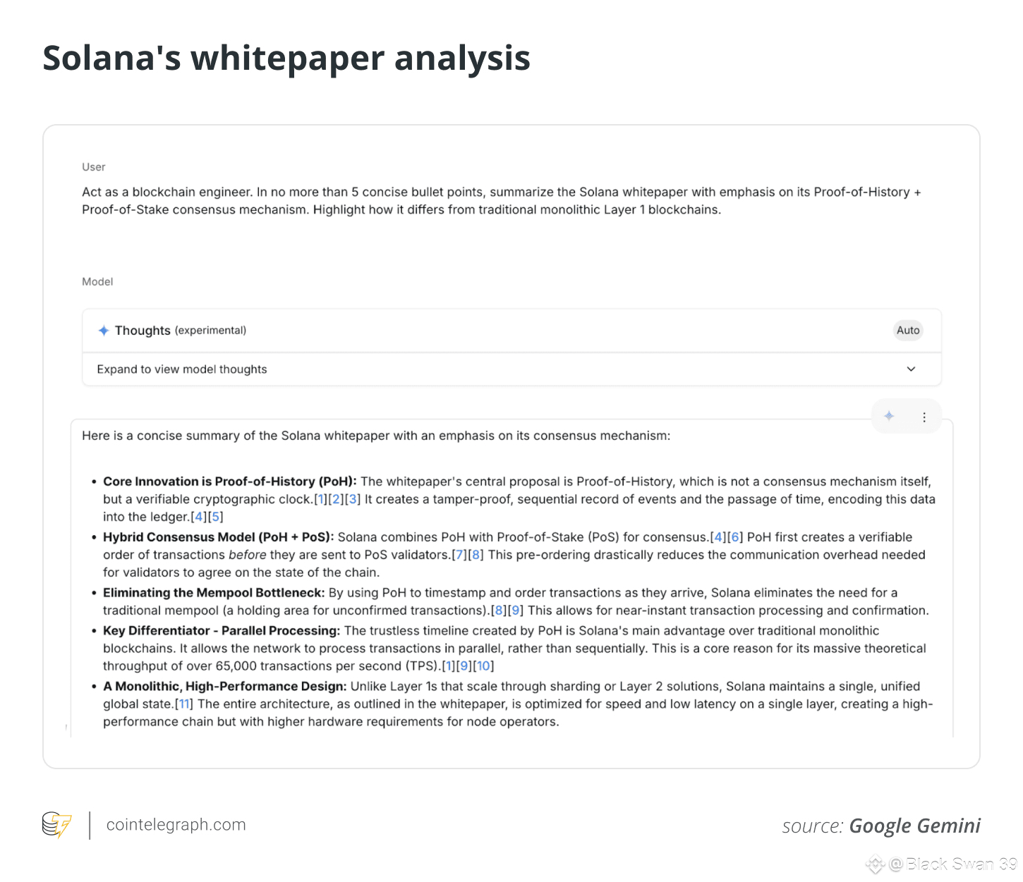 “Hãy hành động như một kỹ sư blockchain. Trong không quá 5 điểm chính, hãy tóm tắt sách trắng Solana, nhấn mạnh vào cơ chế đồng thuận Proof-of-History + Proof-of-Stake. Hãy nêu bật sự khác biệt của Solana so với các blockchain Lớp 1 nguyên khối truyền thống.”
