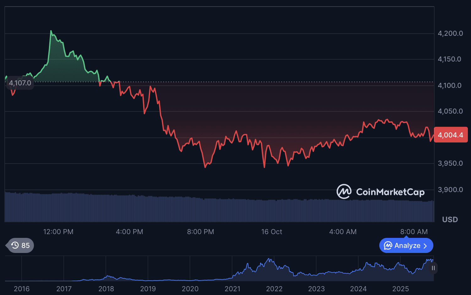 Ethereum încearcă să mențină pragul de 4,000 USD după ce a scăzut cu mai mult de 2% în ultimele 24 de ore. Declinele reflectă o slăbiciune mai largă a pieței, deși menținerea acestui nivel ar putea fi cheia pentru a preveni pierderi mai profunde în rândul principalelor altcoins.