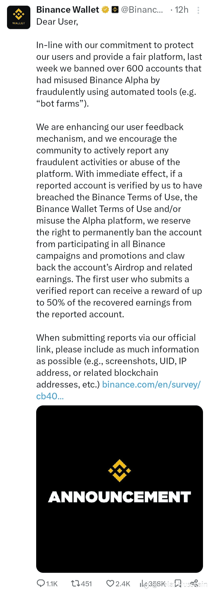 Airdrops Clawed Back: Binance reserves the right to permanently ban violating accounts from all campaigns and claw back fraudulently obtained Airdrops and related earnings.New Whistleblower Reward: The first user to submit a verified report of a violating account can receive a reward of up to 50% of the recovered earnings!