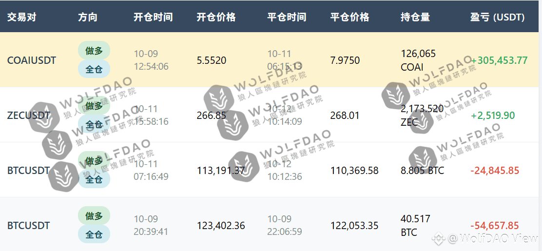 从收益率曲线来看,他在10月11日凌晨市场崩盘时的ROI达到了惊人的280.53%,关键的交易是COAIUSDT这笔神来之笔——他在10月9日以5.55美元的价格开多126,065个COAI,两天后在市场最恐慌时以7.975美元平仓,单笔净赚30.5万美元,这笔交易贡献了他总收益的绝大部分。