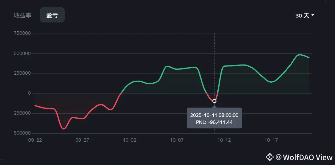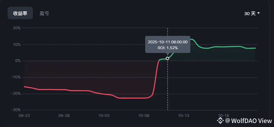 JeromeLoo老王的交易记录展现了一个更加成熟和多元化的交易策略。从收益率曲线可以看到,他在10月11日崩盘前一直维持在-15%到-22%的亏损区间,但崩盘前账户迅速翻红至正收益,ROI达到1.52%后一直保持稳定盈利。这条曲线的关键转折点说明他在崩盘前就已经布局了做空仓位,而不是事后抄底。