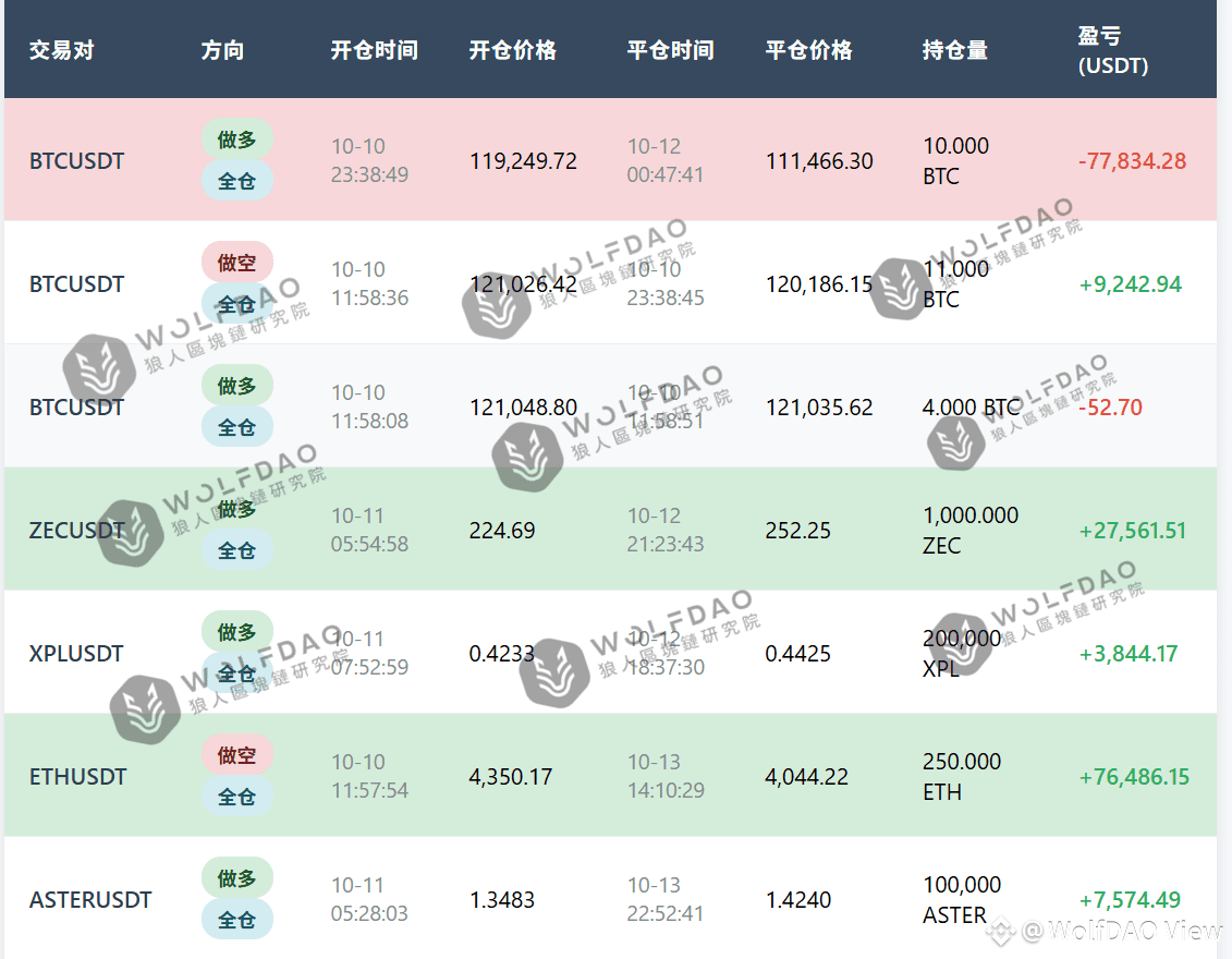 从交易记录来看,他的策略明显比前两位更加系统化。最大的亮点是10月10日开的ETH空单,以4,350美元做空250个ETH,持仓三天后在4,044美元平仓,单笔获利7.65万美元,这是他最大的盈利来源。这笔交易的时机非常精准——在崩盘前一天就开始做空,可能是他提前嗅到了市场风险。同时他也在山寨币上有所布局,ZEC多单盈利2.76万美元,ASTER和XPL的小额多单也都实现盈利。