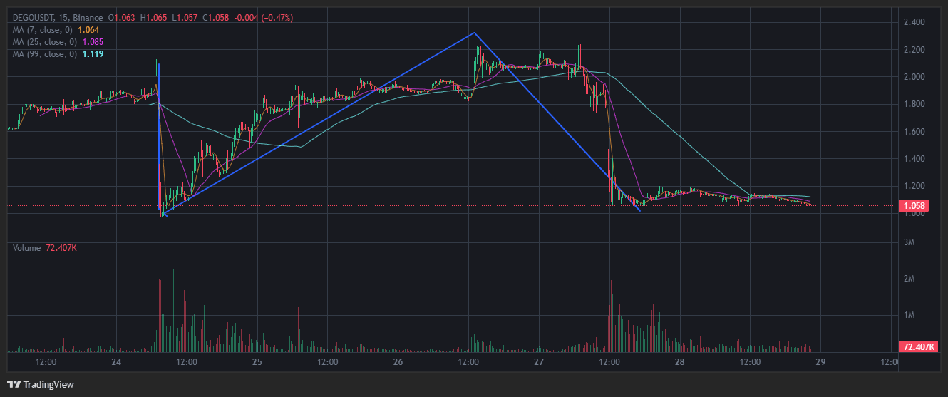 Astăzi am încercat să observ mișcarea DEGO/USDT în intervalul de timp de 15 minute. Dintr-o privire, graficul pare într-adevăr destul de fluctuant în ultimele zile - a crescut puternic în zona de 2.2 USDT, apoi a scăzut treptat până acum rămânând în jur de 1.05 USDT.