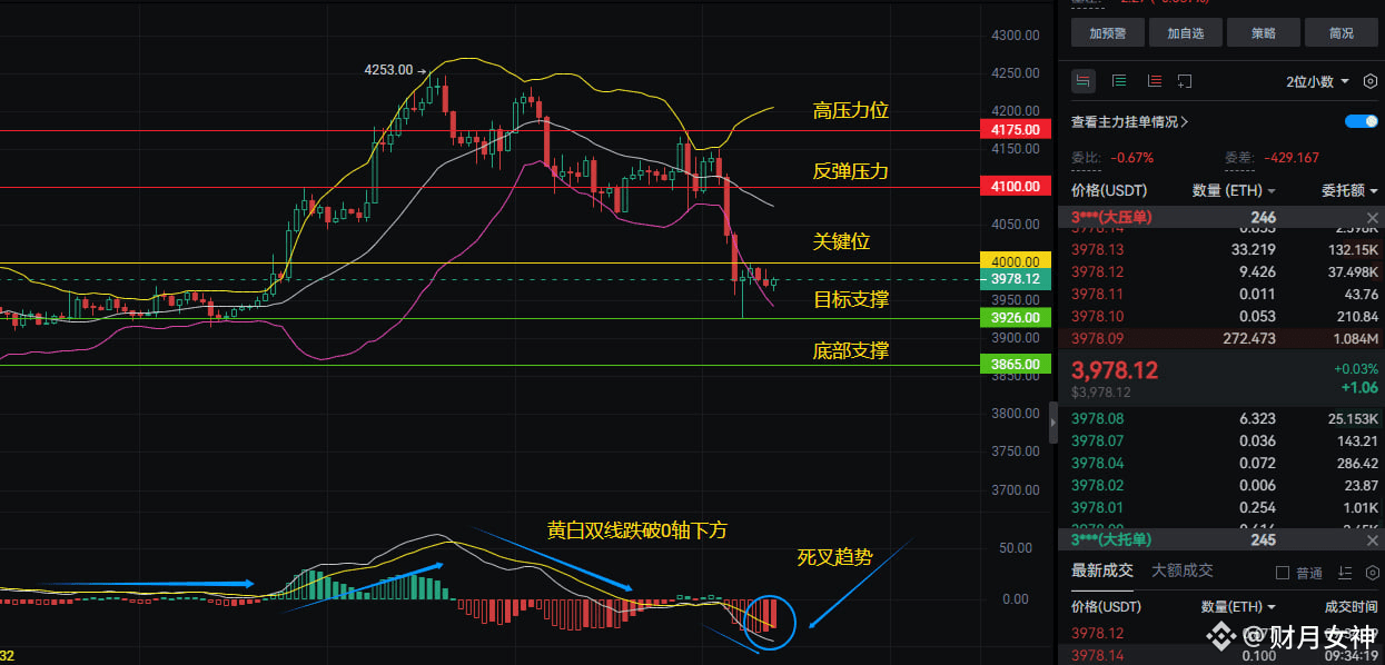 财月拍胸脯说:短期看多! 为啥?死叉信号是吓人,但MACD柱状图缩量、KDJ金叉暗流涌动,多军在憋大招!现在3978刀就是黄金坑,散户该咋办?听好了——3900刀附近闭眼梭多,4000刀上方分批止盈,跌破3865刀立刻割肉跑路! 这波操作敢玩命,年底别墅靠海不是梦!