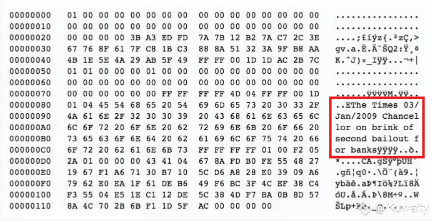 كان ذلك واضحًا في الكتلة الجينية (أول كتلة في سلسلة كتل البيتكوين)، حيث ترك المنشئ رسالة، تُعرف أيضًا باسم رسالة الكتلة الجينية، في 3 يناير 2009: "The Times 03/Jan/2009 Chancellor on brink of second bailout for banks."