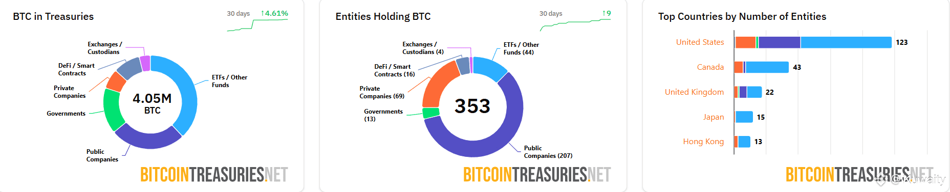 وفقًا للبيانات من BitcoinTreasuries.net، تمتلك أكثر من 353 كيانًا حوالي 4.05 مليون بيتكوين، مما يمثل حوالي 20.31% من المعروض المتداول الحالي للبيتكوين البالغ 19.94 مليون و19.3% من إجمالي المعروض البالغ 21 مليون بيتكوين.