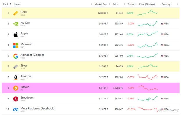 أصبح البيتكوين، الذي كان مرادفًا لمثل سايبر بانك من الخصوصية واللامركزية، الآن يقف جنبًا إلى جنب مع الأصول التقليدية في محافظ أكبر المستثمرين في العالم، حيث وصلت قيمته السوقية الحالية إلى أكثر من 2.18 تريليون دولار ويحتل المركز الثامن في قائمة الأصول الأعلى من حيث القيمة السوقية في العالم، متجاوزًا شركات رائدة مثل برودكوم وميتا بلاتفورمز، كما هو موضح في الصورة أدناه.