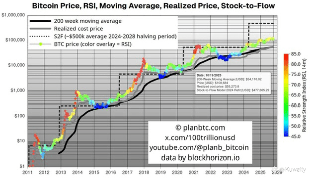 وفقًا لأحدث تحليل من PlanB، يستمر سعر البيتكوين المدرك في تتبع المتوسط المتحرك لمدة 200 أسبوع، مع بقاء مؤشر القوة النسبية (RSI) على مدى 14 شهرًا دون 80 حتى منتصف أكتوبر 2025 - وهي علامة على أن البيتكوين لم يدخل بعد مرحلة تقييم مفرط، والتي يعتبرها ضرورية قبل حدوث أي تصحيح عميق.