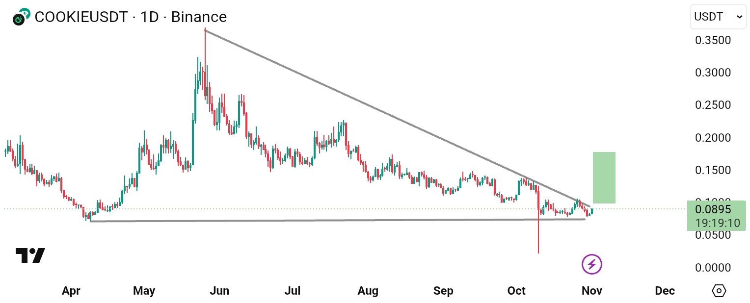 $COOKIE formează un Wedge Descendent clar 📈 pe intervalul zilnic după o scădere de -74%, acum menținând un suport puternic la 0.0895 USDT 🧠.