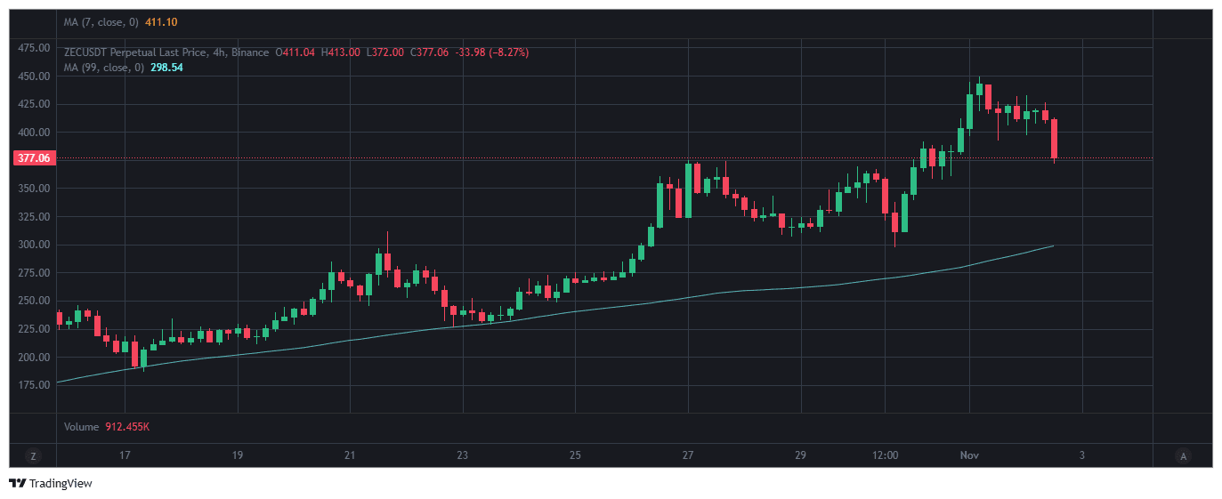 $ZEC Graficul pe 4 ore arată o tendință ascendentă parabolică puternică care a atins un vârf aproape de 450 $. Acest vârf a fost întâmpinat cu o presiune extremă de vânzare, rezultând într-o lumânare roșie masivă care a șters o porțiune semnificativă din câștigurile recente. Acesta este un semnal puternic al unui potențial vârf major, iar momentumul bullish a fost violent oprit.