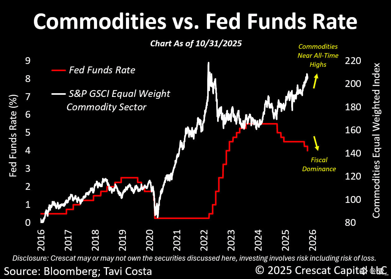 Commodities are rewriting the market playbook, and what’s happening right now defies decades of conventional financial wisdom. The S&P GSCI Equal Weighted Commodity Index is up roughly 25 percent year over year, even as the Federal Reserve has begun cutting rates. This goes against the historical pattern where commodities tend to peak when the Fed tightens policy, not when it loosens it. This time, the market is telling a different story, one where fiscal dominance, structural inflation, and the global shift in capital flows are rewriting the rules of monetary reality.