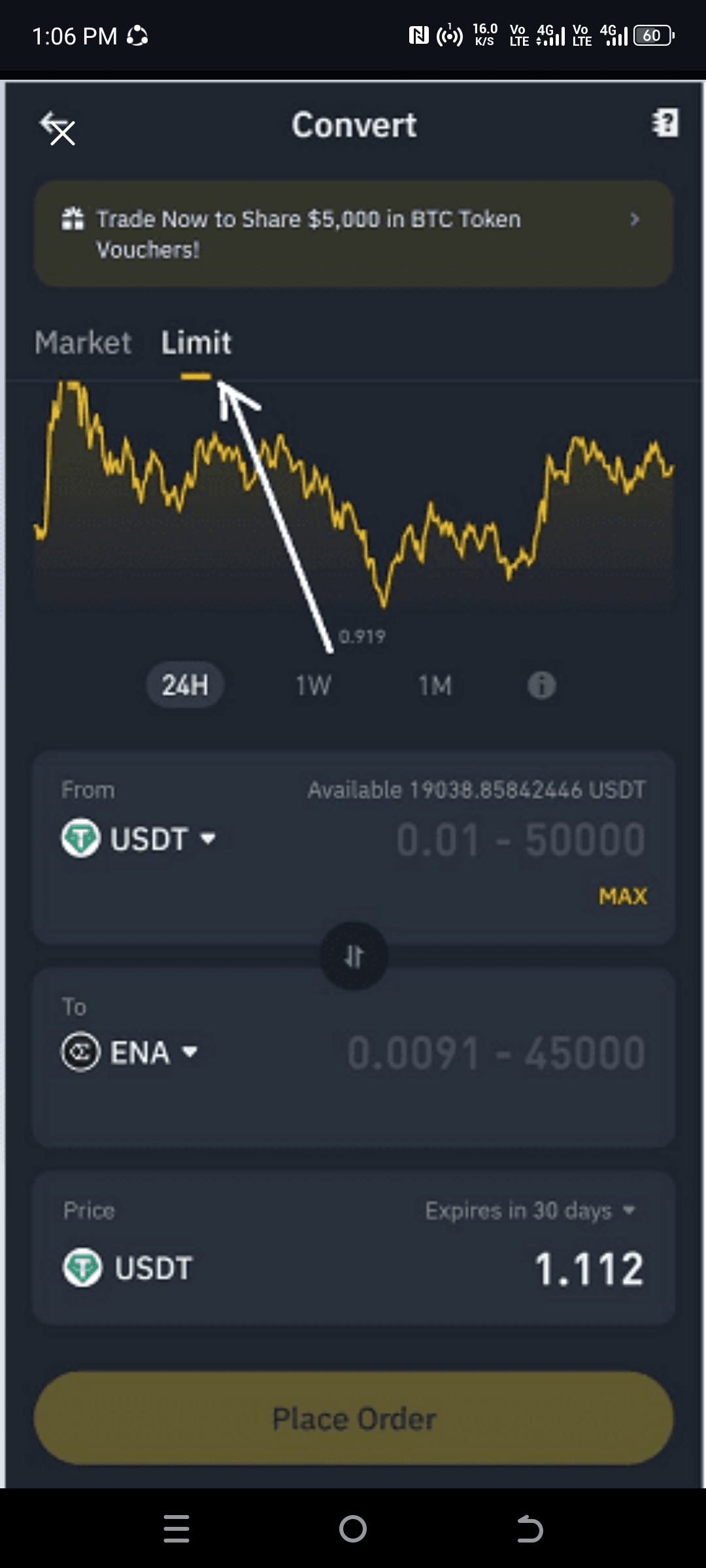 Alege orice criptomonedă dorești să convertești în orice altă criptomonedă. Să zicem că în imaginea de mai sus dorești să convertești din BNB în USDT.