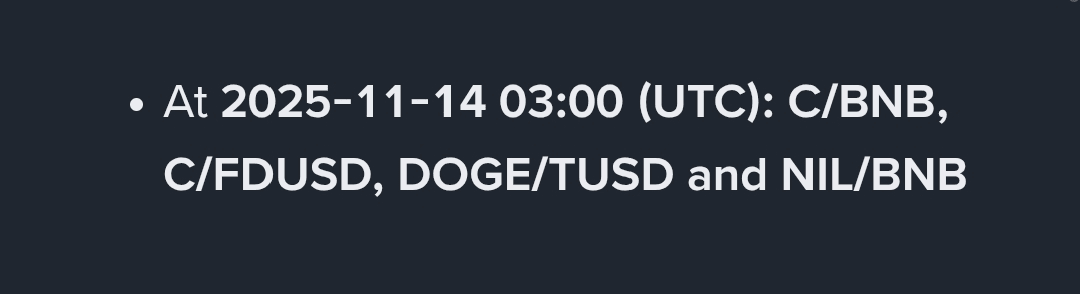 La 2025-11-14 🕒03:00(UTC) :C/BNB,C/FDUSD,DOGE/TUSD & NIL/BNB ❌🚫🚨📢📢📢📢. #DelistingAlert #spotdelisting #viralpost #BinanceVietnamSquare #PowellWatch $NIL $DOGE $C