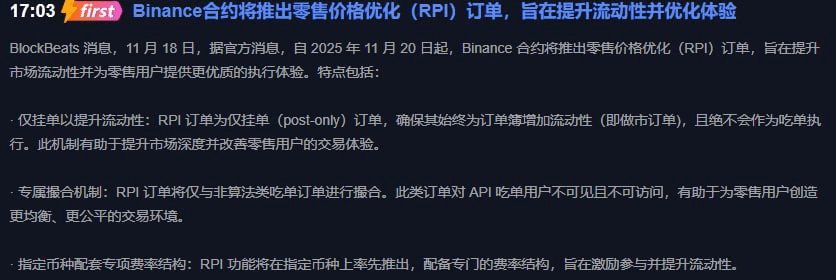 Binance contractul se va lansa în curând cu optimizarea prețurilor pentru retail, programat pentru 20 noiembrie 2025. Acesta, pe scurt, este un mod de a da un impuls pieței, pentru a asigura o lichiditate mai bună, astfel încât și noi, utilizatorii mici, să putem obține prețuri mai bune. Caracteristicile sunt foarte simple - doar comenzi plasate, fără a consuma comenzi, special conceput pentru a trata diverse injustiții și pentru a economisi ceva taxe. Pe termen scurt, această veste ar putea aduce un sentiment pozitiv pentru BNB, având în vedere că Binance inovează, iar prețul monedelor tinde să crească rapid.