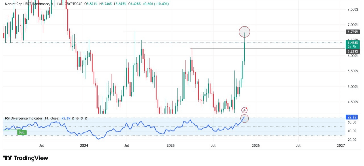 $USDT Dominanța a intrat într-o zonă puternic supracumpărată, atingând un nivel cheie de rezistență săptămânal. Istoric, când USDT.D ajunge în această zonă, lichiditatea începe să revină în BTC și Altcoins, declanșând recuperări pe întreaga piață.