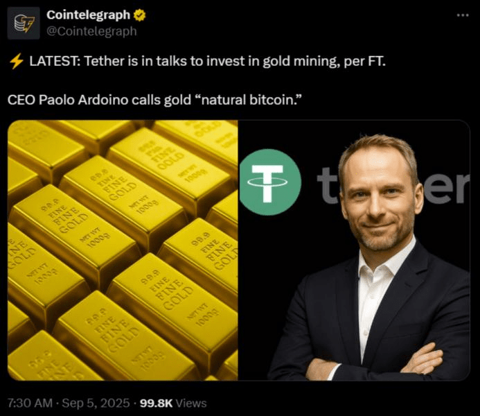 De asemenea, Tether și-a consolidat prezența semnificativă pe piața mărfurilor prin produsul său Tether Gold, simbolizat pe aur, care a câștigat popularitate în piața ascendentă actuală. Paolo Ardoino a confirmat că compania deține peste 100 de tone de lingouri de aur fizic.