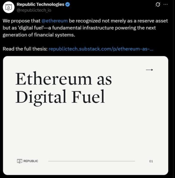 A devenit compania Republic Technologies cea mai recentă companie care adaugă eter în portofoliile sale, după ce a obținut finanțare în valoare de 100 milioane de dolari în condiții considerate excepționale în acest sector. A fost structurată o tranzacție sub formă de obligațiuni convertibile fără dobândă, ceea ce înseamnă că Republic nu plătește dobânzi și nu se confruntă cu riscul de neplată din cauza neplății, ceea ce este rar în peisajul finanțării cripto.