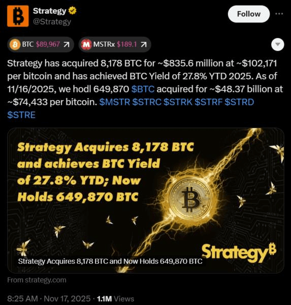 Strategy deține acum aproximativ 650.000 de bitcoin, consolidându-și poziția ca cea mai mare rezervă de bitcoin instituțională din lume cu o marjă largă. Compania continuă să suporte declinul recent al pieței și ar putea rămâne pe drumul de a se alătura indicelui S&P 500 până în decembrie, conform unui raport recent de la Matrixport.