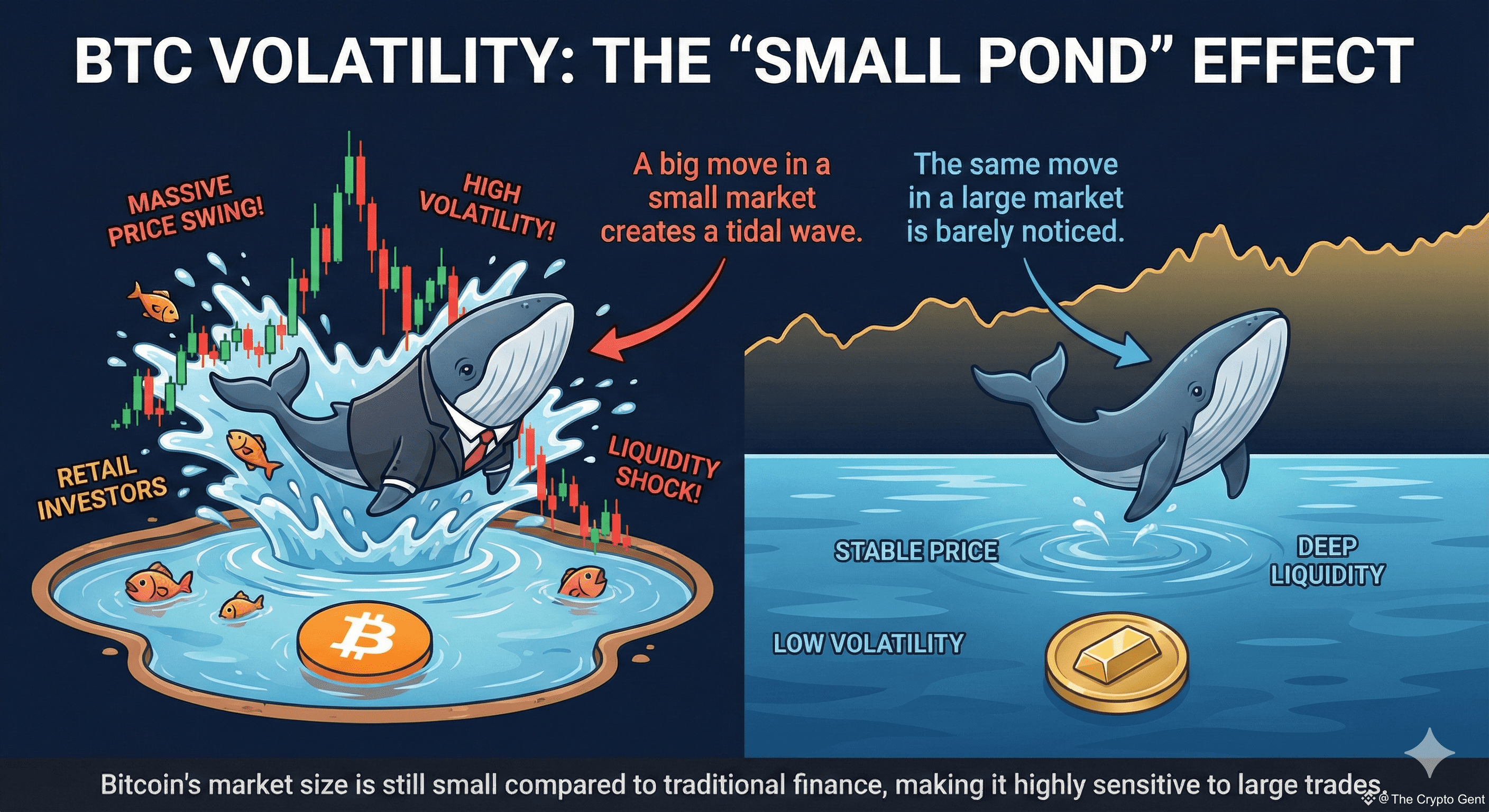 * Bitcoin ($1-2 Trillion) is a Lake. If a "Whale" (a billionaire investor) drops a rock in it, it creates massive waves.