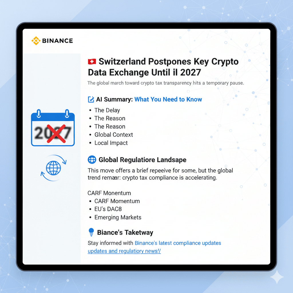 $BTC Marșul global către transparența fiscală în criptomonede a întâmpinat o pauză temporară într-un hub financiar cheie. Elveția a anunțat o întârziere în schimbul automat al informațiilor conturilor de criptomonedă cu autoritățile fiscale internaționale conform Cadru de Raportare a Cripto-Activelor (CARF) până cel puțin în 2027.