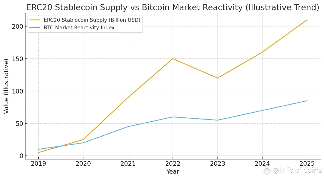 The supply of ERC20 stablecoins has reached a new record high, marking an important moment for the broader crypto market. As stablecoins increase, they bring more liquidity and buying power into the ecosystem. This growing supply is influencing Bitcoin trends because traders often use stablecoins to enter or exit BTC positions quickly. With more stablecoins available, market movements can become faster and more reactive, especially during volatile periods. The rise also shows that users trust stablecoins for storing value, trading, and managing risk. This trend highlights how stablecoins now play a major role in shaping Bitcoin’s short-term and long-term market activity.