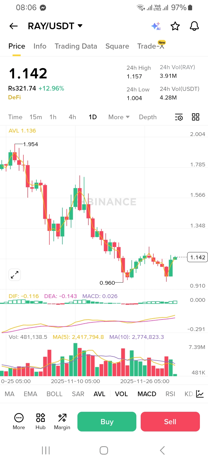 RAY se consolidează deasupra suportului de $1.00, construind o structură bullish pe termen scurt. Atâta timp cât prețul rămâne deasupra acestui nivel, o mișcare către $1.07 și mai sus devine din ce în ce mai probabilă. O scădere înapoi sub $1.00 ar slăbi setarea actuală.