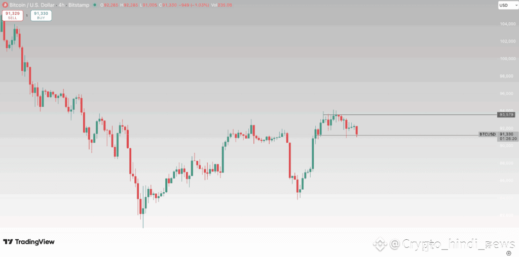 फिलहाल छोटे टाइम फ्रेम पर Bitcoin और Ethereum दोनों में कोई खास हलचल नजर नहीं आ रही है। Bitcoin पिछले दो दिनों से $91,000 से $93,500 के दायरे में फंसा हुआ है। इस रेंज के बाहर जैसे ही कीमत जाती है, वैसे ही वह उसी चार घंटे की कैंडल में वापस लौट आती है।