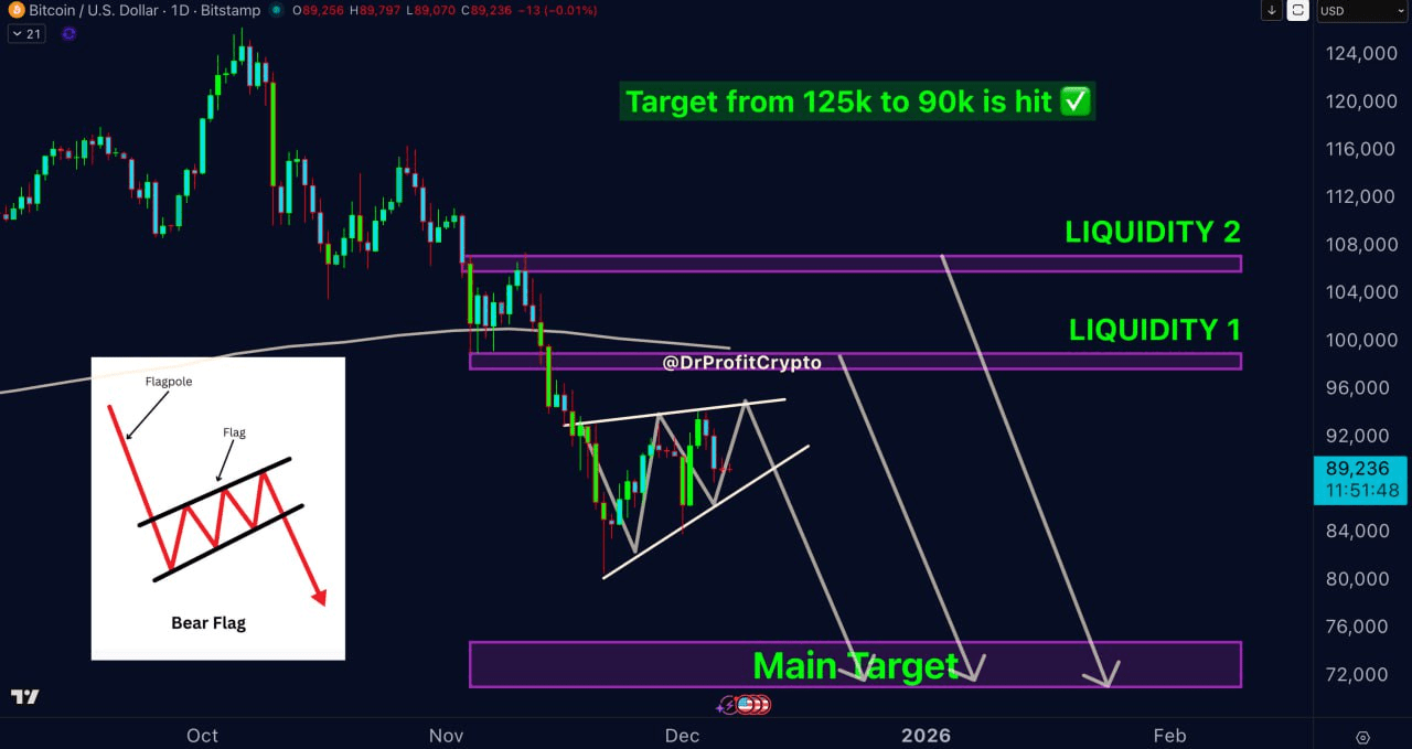 Răspunsul este simplu: piața tranzacționează în probabilități. În opinia mea, intrările mele nu vor fi atinse timp de cel puțin următorul an. Indiferent de ceea ce se întâmplă, aceste short-uri vor rămâne adânc în profit deoarece intrările au fost perfecte. Probabilitatea de a atinge regiunea de 70k este extrem de ridicată, în opinia mea, singura întrebare este cât de sus va merge pompa falsă înainte de următoarea mișcare în jos. Va fi o scădere din structura actuală a steagului bearish, 97-100k și în jos? Sau vom vedea o mișcare mai puternică maxim până la regiunea de 107k și vom continua mișcarea în jos? Aceste întrebări duc la un singur răspuns și anume că 70k se apropie după unul dintre evenimentele menționate mai sus.
