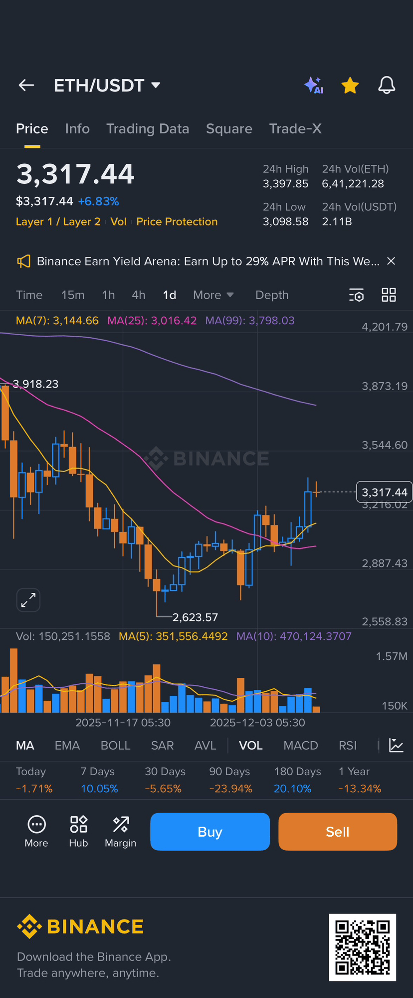 Din captura de ecran, $ETH se tranzacționează în jur de $3,317.44, în creștere cu aproximativ +6.8% — un salt solid. Înălțimea de 24 de ore a fost aproape de $3,397.85, iar minimul în jur de $3,098.58. Asta arată că există o volatilitate, dar și o recuperare clară.
