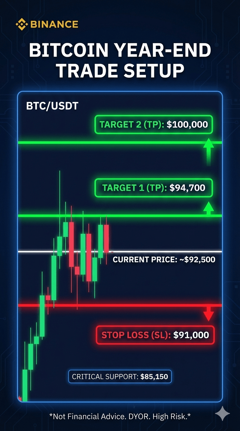 Graficele nu mint, iar configurația pentru ultima împingere a Bitcoin-ului din 2025 devine din ce în ce mai clară cu fiecare oră. Pe măsură ce BTC plutește în jurul valorii de 92.500 de dolari, traderii își îndreaptă atenția către un "Change de Final de An" cu mize mari, care echilibrează o gestionare strânsă a riscurilor cu recompensa psihologică supremă: 100.000 de dolari.