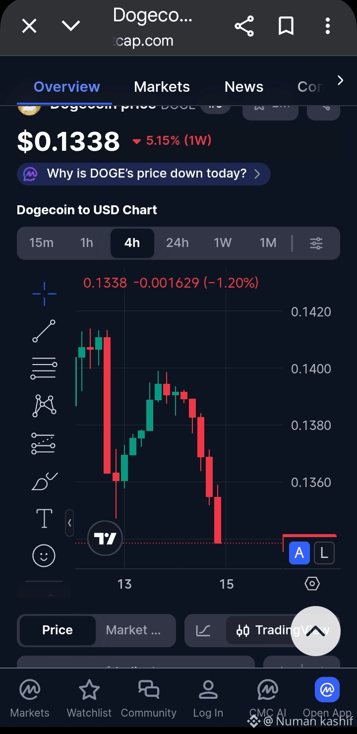 Dogecoin (DOGE) is currently facing downward pressure, and as shown in the chart above, the price has dropped to around $0.133 over the past few days. Many long-term holders and small investors are concerned because DOGE$DOGE has been moving sideways or downward for almost a month.