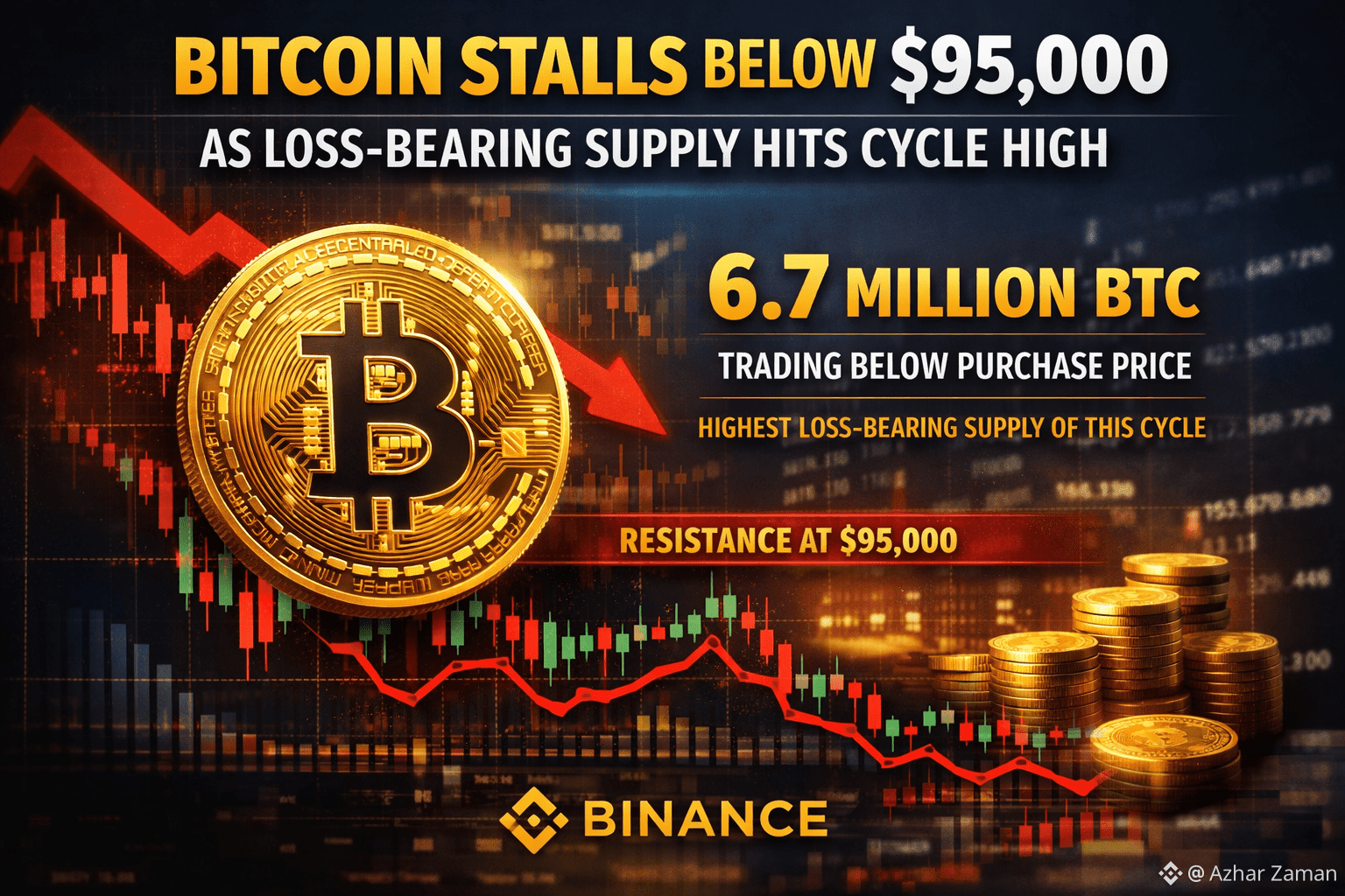 Bitcoin (BTC) continues to trade below the key $95,000 level, showing signs of consolidation as on-chain data points to rising unrealized losses among market participants.