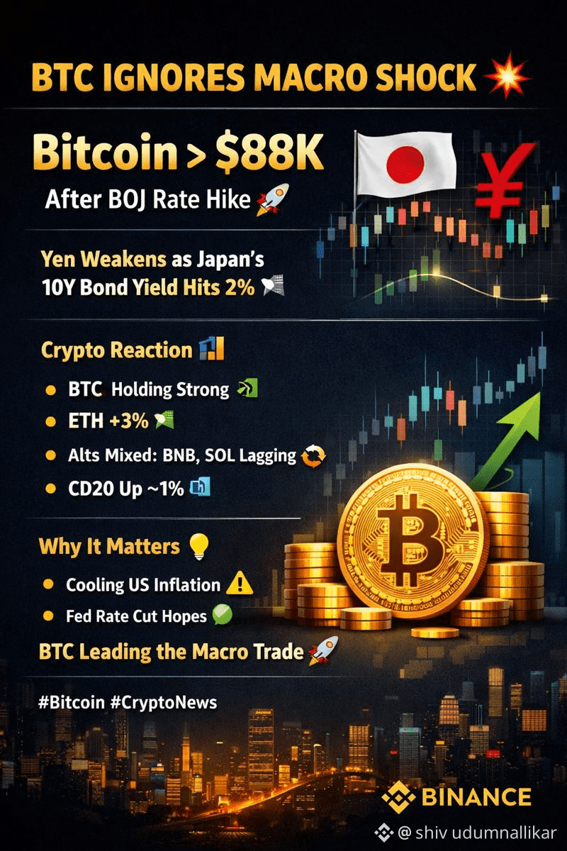 Bitcoin climbed above $88K even after the Bank of Japan hiked rates to the highest level in ~30 years — something that usually strengthens the yen and pressures risk assets.