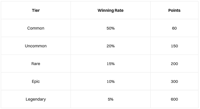 Aceste NFT sunt împărțite în cinci niveluri diferite, fiecare reprezentând un nivel diferit de raritate și oportunitate. Acumulând NFT-uri de nivel înalt și sporind deținerile dvs. NFT, vă creșteți șansele de a primi recompense mai mari!