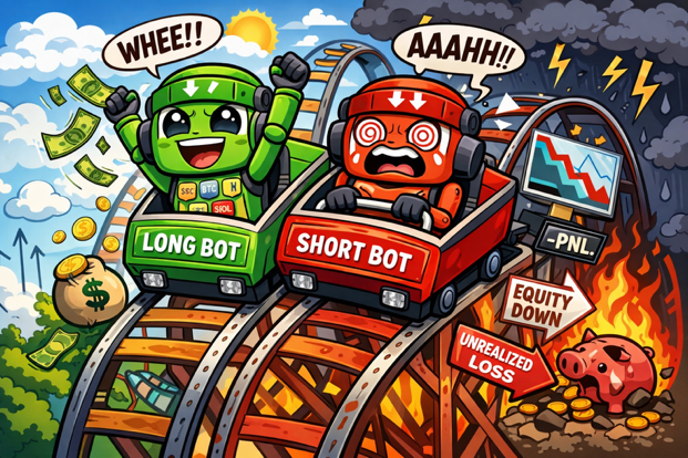 A fost o vreme când eram destul de încrezător că am venit cu o strategie „dificil de pierdut”: rularea a două boturi de grilă pentru futures în același timp - unul Long și unul Short - pe aceeași pereche de tranzacționare. În mintea mea, logica părea impecabilă. Dacă piața se mișca lateral, ambele boturi ar fi adunat profituri din grilă. Dacă prețul creștea, botul Long ar fi avut profit. Dacă prețul scădea, botul Short ar fi compensat. Doar auzindu-l suna deja ca soluția perfectă pentru cineva care nu este bun la prezicerea direcției pieței, mai ales în timpul unei piețe laterale.