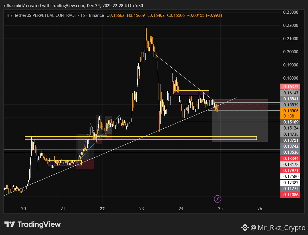 The short-term trend for H/USDT is currently bearish. After a significant uptrend, the price formed a consolidation pattern (appears to be a symmetrical triangle or descending pennant) and has recently broken below its lower ascending support trendline. This indicates a loss of bullish momentum and a potential continuation of the downtrend from the recent peak.