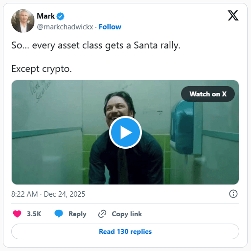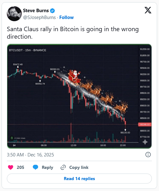 Un tranzactionar popular, Steve Burns, a postat o observație destul de amuzantă pe X despre așteptările din comunitatea criptomonedelor: „Rally-ul lui Moș Crăciun din Bitcoin merge în direcția greșită.”