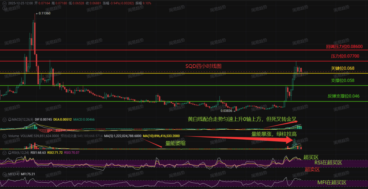 Semnul mai important este că atât RSI, cât și indicatorul de flux de fonduri MFI au intrat deja în zona „supra-cumpărare”. Acest lucru înseamnă că forța de cumpărare s-a consumat în scurt timp, asemenea unui arc comprimat prea tare, care poate să se întoarcă oricând. Deși MACD este în cruce ascendentă, coloanele de volum încep să oscileze, ceea ce arată o împărțire a forței de creștere.