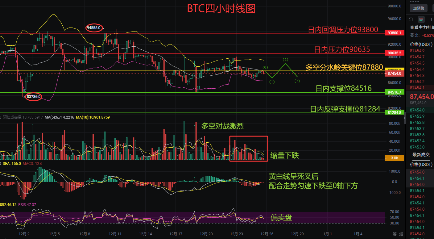 Din graficul pe 4 ore, BTC se află în prezent într-o perioadă de consolidare, MACD a avut un crossover descendent și a ajuns sub axa 0, ceea ce indică faptul că vânzătorii sunt încă activi. Dar iată cheia: prețul nu a străpuns suportul cheie, dimpotrivă, după fluctuație a apărut o tendință de creștere!