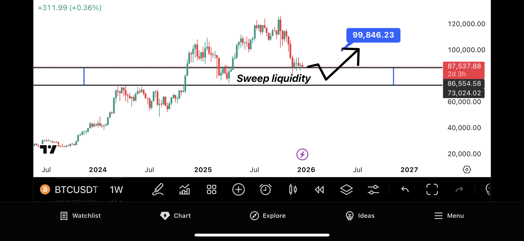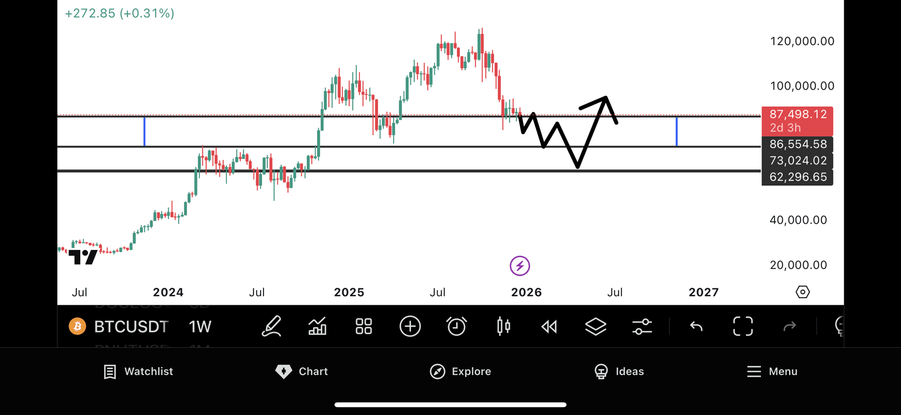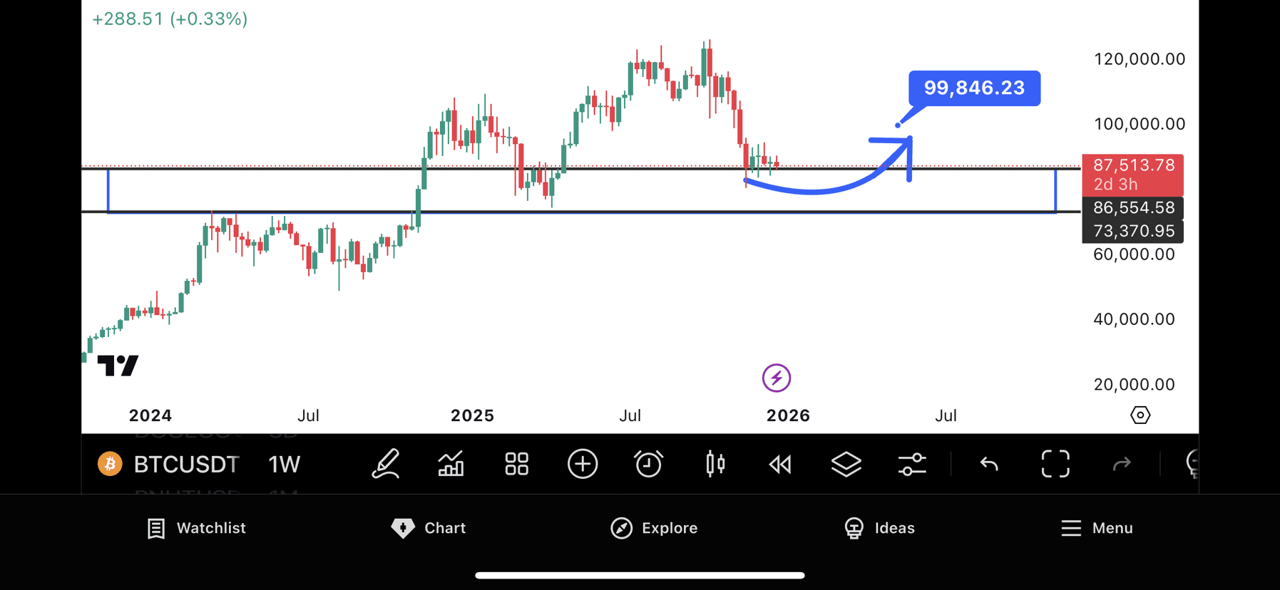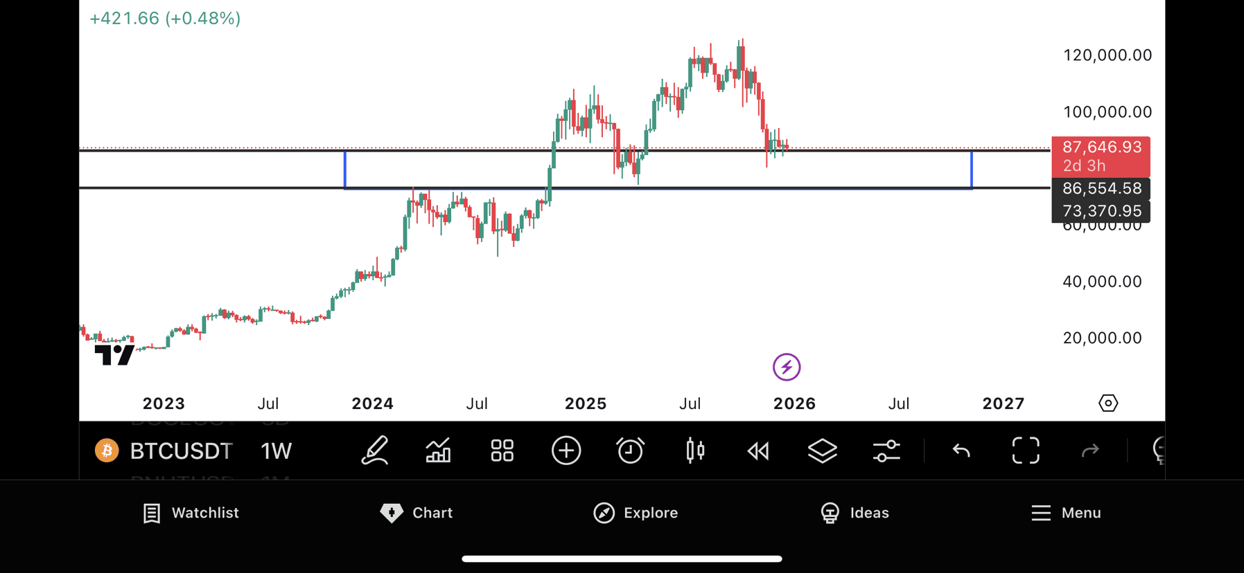 Este mai puțin probabil ca Bitcoin să rupă zonele inferioare înainte de a se deplasa la 100$k atâta timp cât bitcoin rămâne în interval.