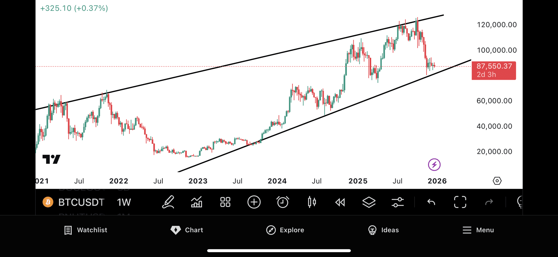 Pe intervalul săptămânal, Bitcoin continuă să tranzacționeze într-un interval mai larg de creștere, deși momentumul pare să încetinească. Această comportare a prețului actual este consistentă cu modelele psihologice pe care le vedem adesea pe piață înainte ca o mișcare majoră să aibă loc.