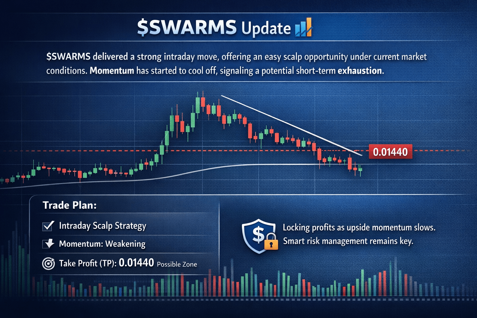 $SWARMS a avut o mișcare puternică intraday, oferind o oportunitate ușoară de scalping în condițiile actuale de piață. Momentumul a început să se răcească, semnalizând o potențială epuizare pe termen scurt.