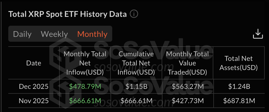 Tranzacționarii subliniază că strângerea ofertei susține o perspectivă bullish, în timp ce analiștii notează, de asemenea, că ETF-urile își poziționează treptat XRP ca un activ de grad instituțional pentru 2026. ETF-urile XRP continuă să arate câștiguri consistente în ultima săptămână a acestui an. În total, fondurile XRP au atras 478 milioane de dolari în această lună.