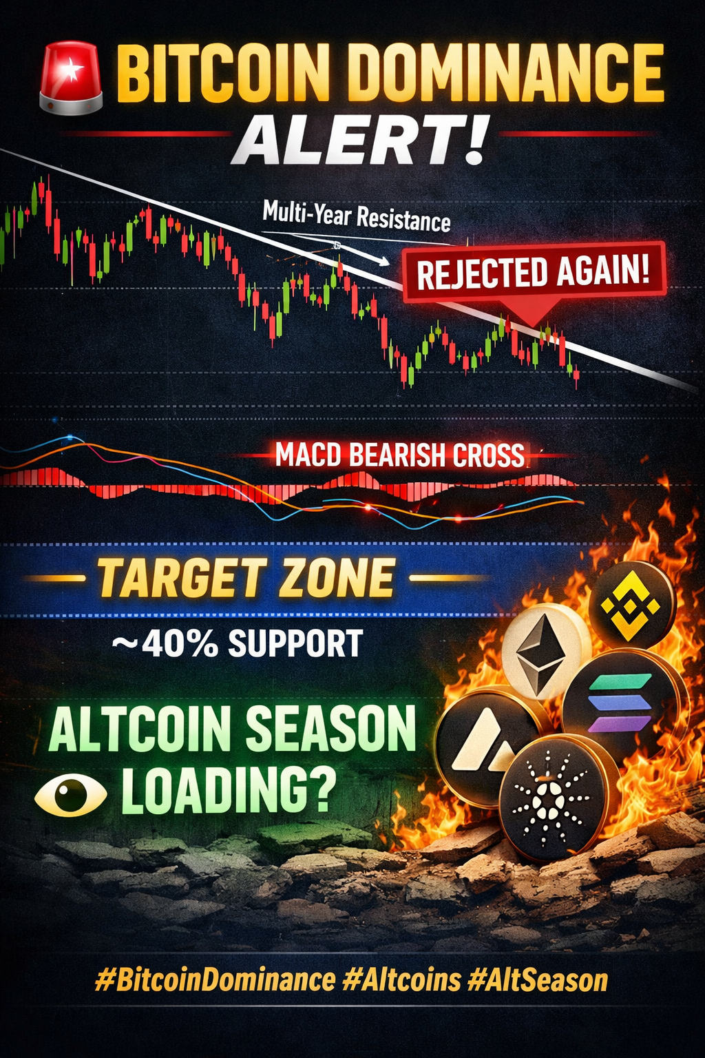 🎯 Zona cheie de suport se află în jur de 40% — dacă este atinsă, aceasta ar putea declanșa o rotație completă a altcoin-urilor.